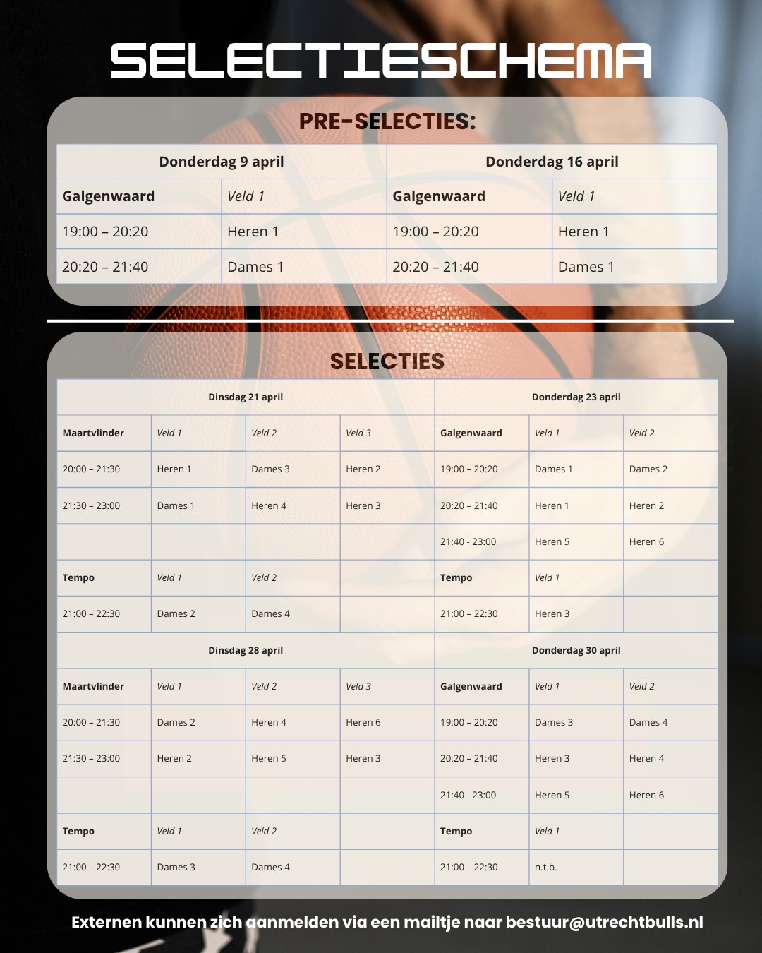 Hieronder kunnen jullie het schema vinden, met dank aan de TC! De trainingen in de Maartvlinder zijn op dinsdagen en in de Galgenwaard op donderdagen. Dit jaar komt er ook de Tempo bij op zowel de dinsdag als de donderdag! Let daarom goed op de tijden, dagen en locatie van de selectietrainingen die je wilt bijwonen!